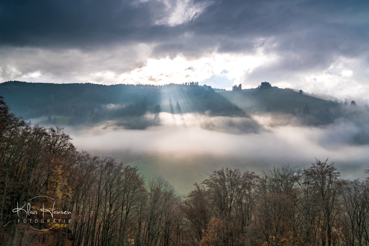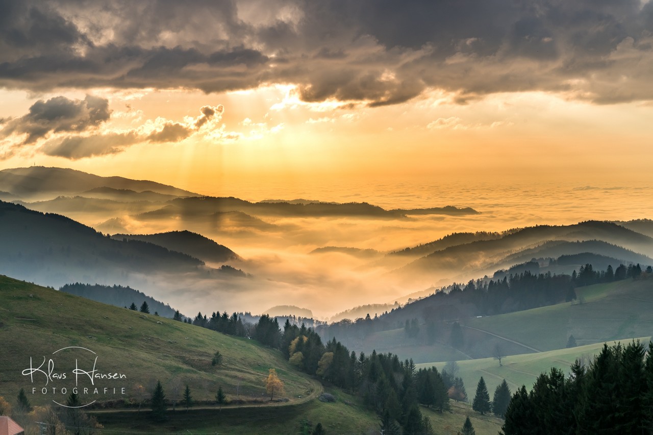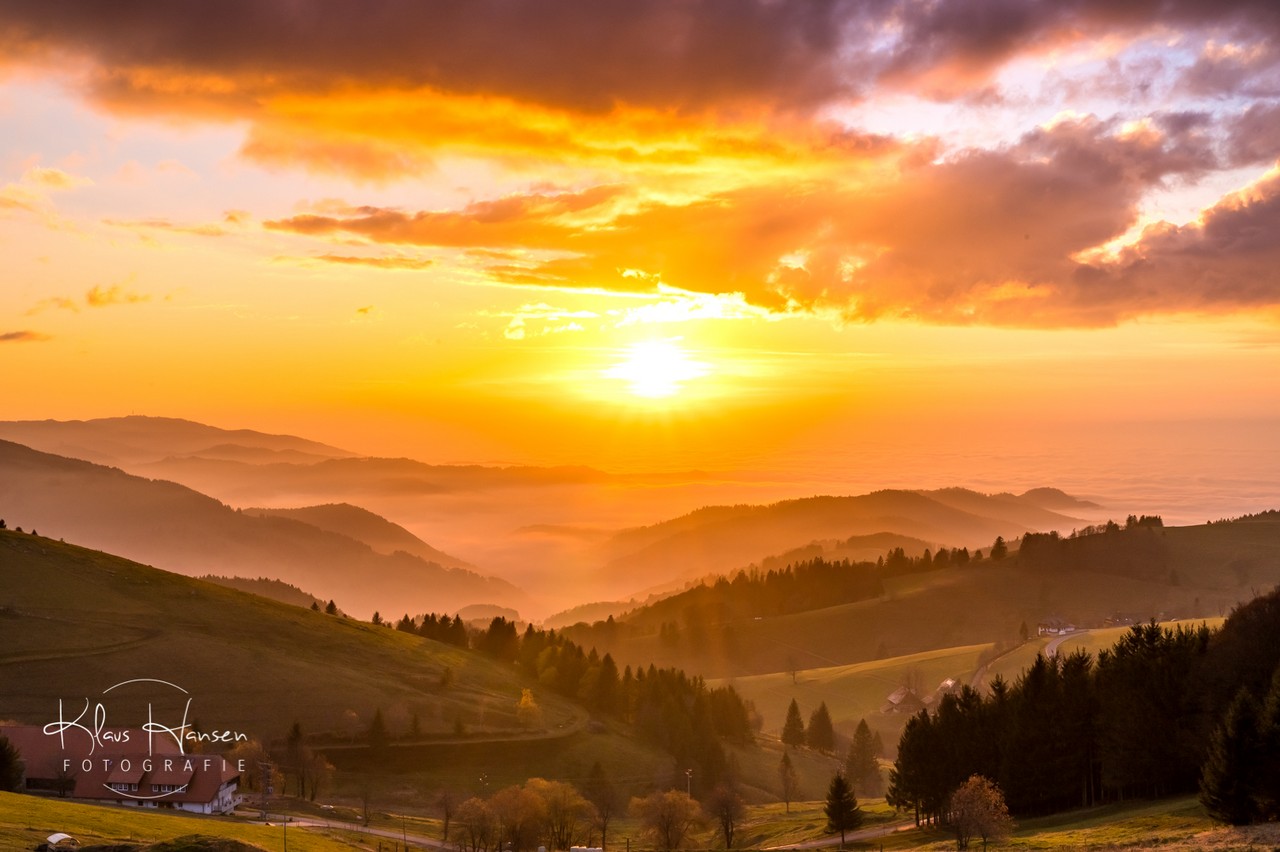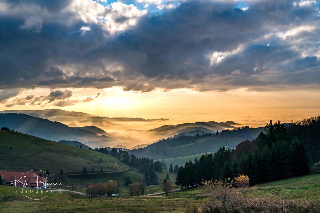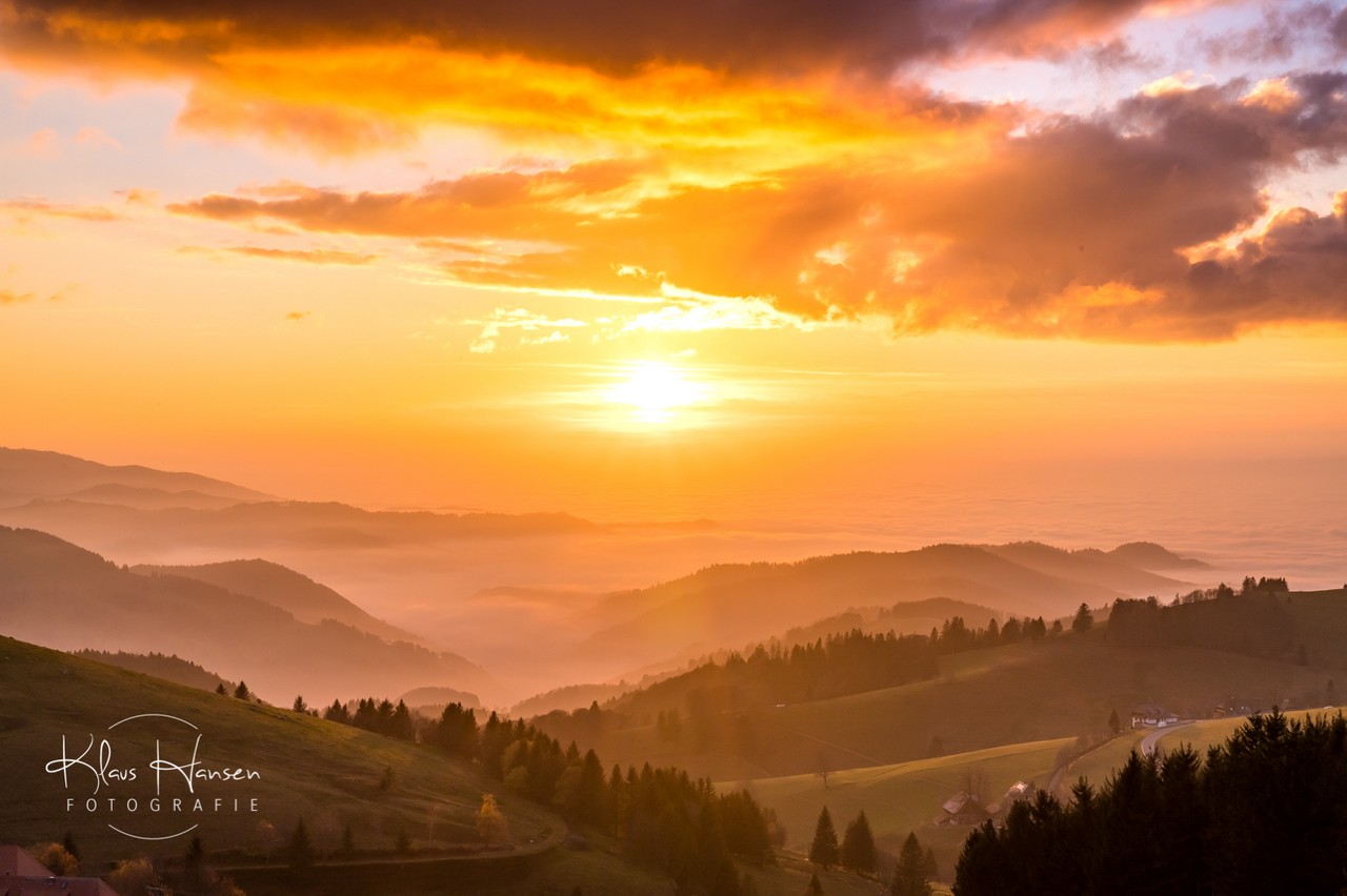 Das Münstertal Blick vom Köpfle St. Trudpert und Schauinsland an einem Tag. Im Nebel unten und oben der Sonnenuntergang über dem Wolkenmeer